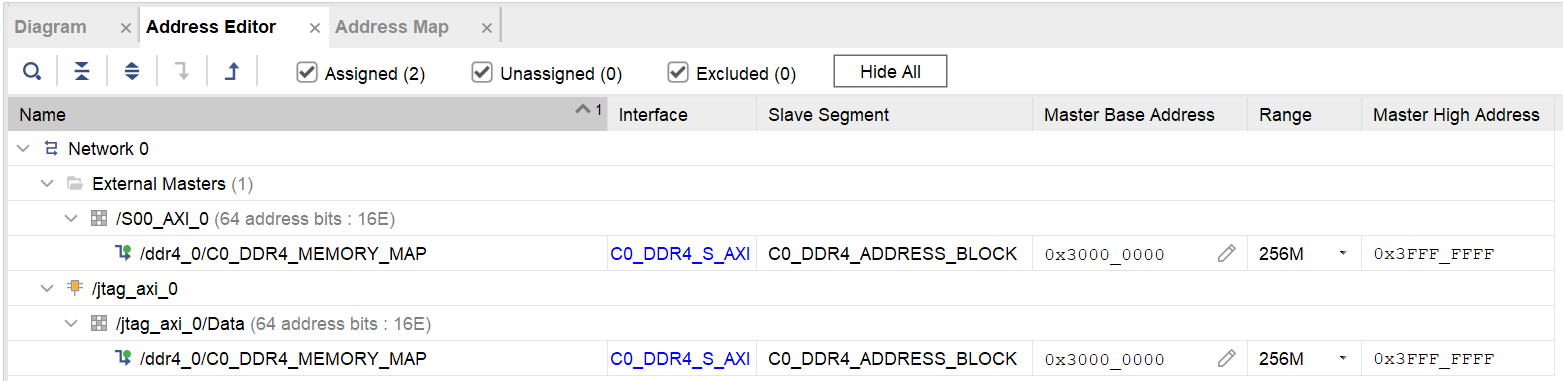 关键配置:打开 Block Design 的 Address Editor 选项卡,必须确保所有模块 (包括 S00_AXI_0 和 jtag_axi_0) 的地址映射符合 soc_pkg.sv 定义。