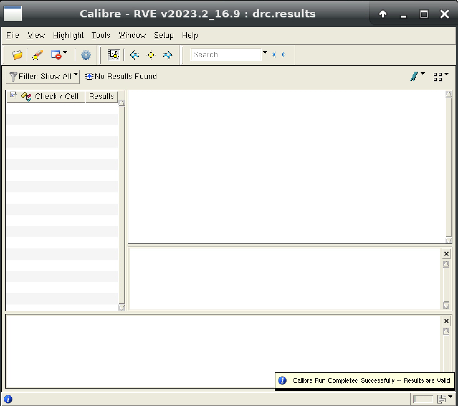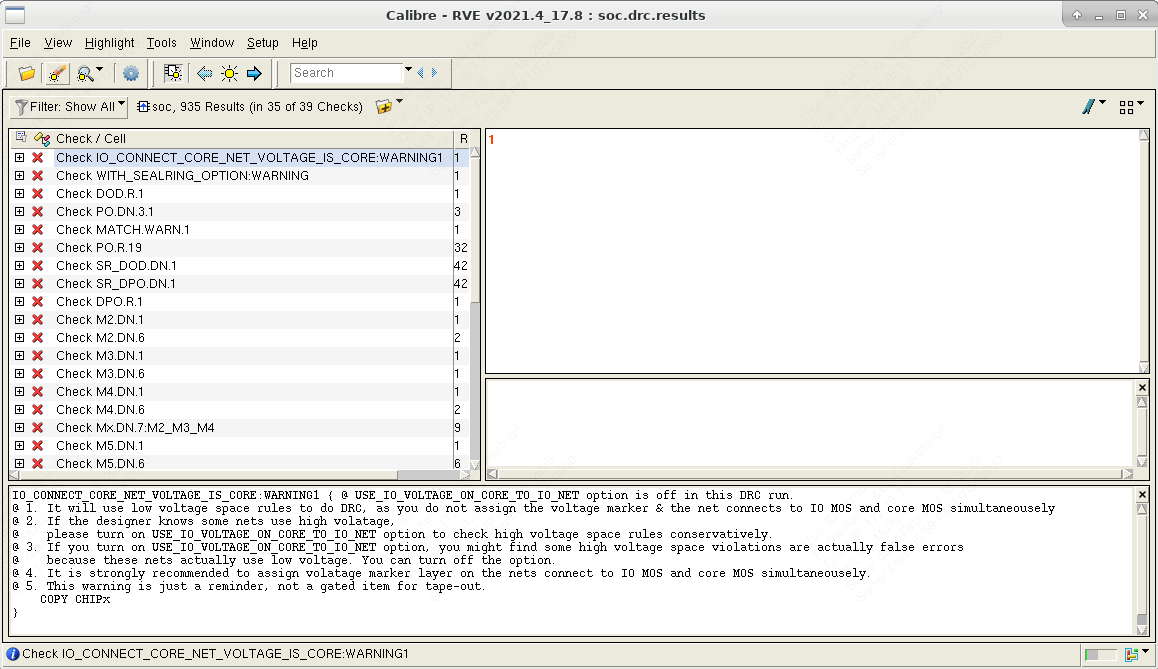 在 Calibre Interactive 左侧选择 Run DRC。可以在 pv/workspace/drc/ 中查看 DRC 报告,或者在 GUI 界面中查看更多的版图信息,包括报错的 Cell、Net 位置等。