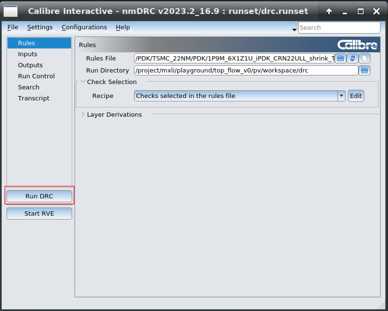 Rules导入 DRC Rules,位于/PDK/TSMC_22NM/PDK/1P9M_6X1Z1U_iPDK_CRN22ULL_shrink_T-N22-CR-SP-004-W1_v1.3_1p1a_20211230/Calibre/drc/calibre_block.drc,并设置 DRC 输出文件路径为pv/workspace/drc; - 在 Calibre Interactive 左侧选择