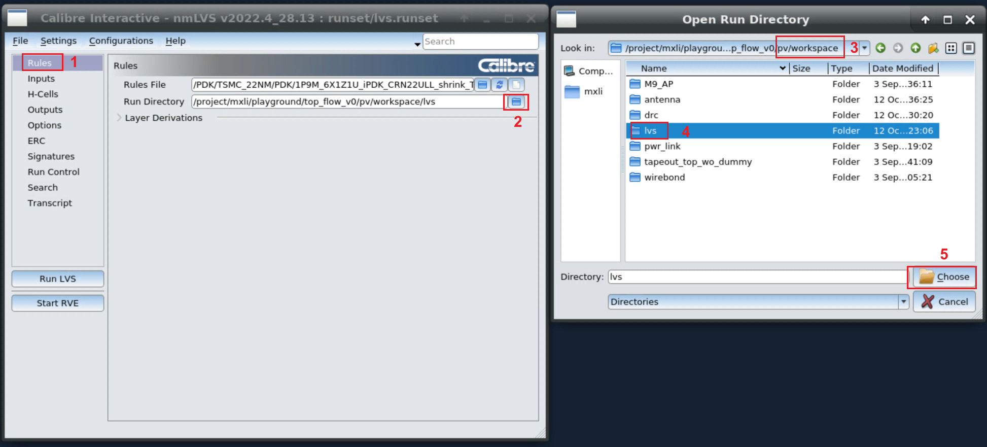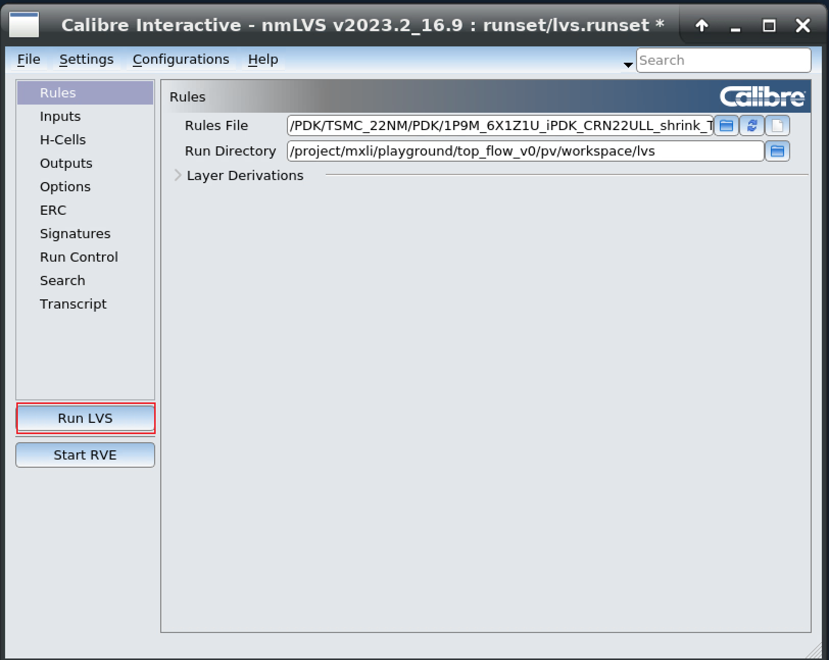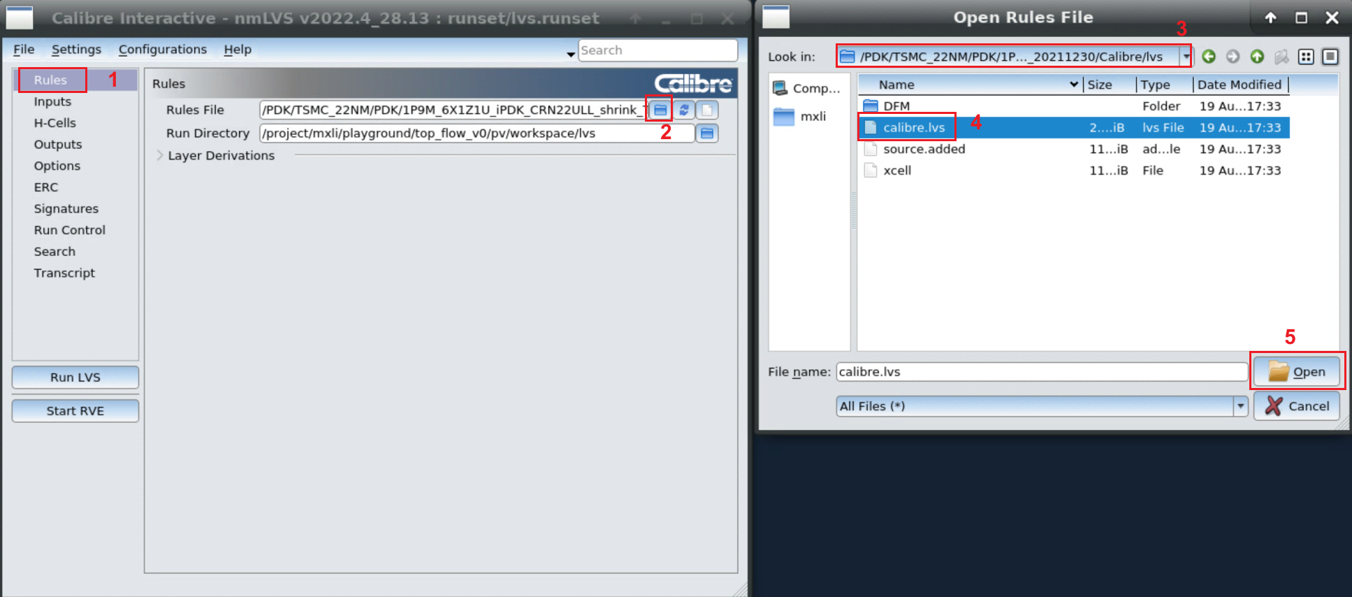 随后,按照如下操作步骤导入 LVS Rules,文件位于 /PDK/TSMC_22NM/PDK/1P9M_6X1Z1U_iPDK_CRN22ULL_shrink_T-N22-CR-SP-004-W1_v1.3_1p1a_20211230/Calibre/lvs/calibre.lvs 路径。