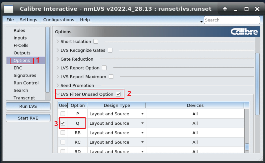此时我们设置 Filter Unused Device Options,勾选其中的 Q 选项,即 MOS, bipolar, resistor, capacitor, and diode devices with no general paths to any non-power/ground pads,如下图中 3* 所示,此时重新进行 LVS 物理验证,会发现 LVS 验证通过。