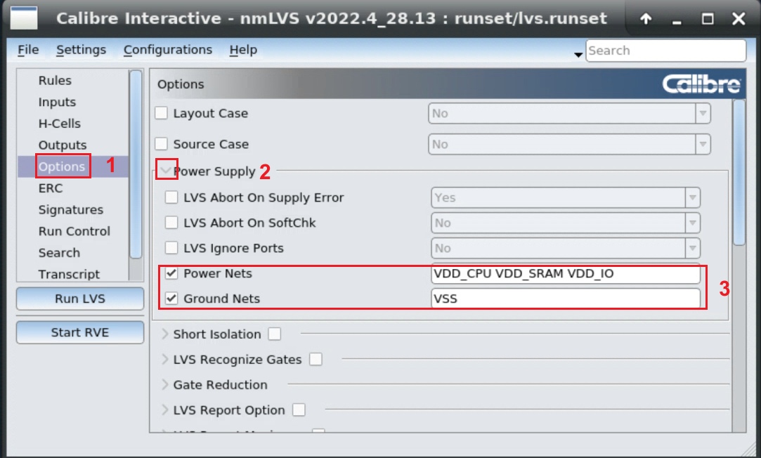 导入了 LVS 所需的输入文件之后,在 LVS Options 设置 LVS 物理验证的运行选项,以下对 Supply, Connect, Gates, LVS Box 四个选项进行简要说明。