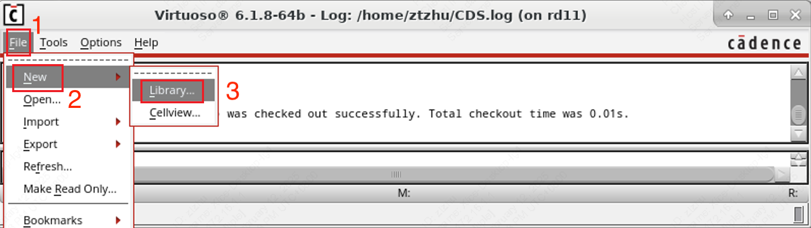 首先,在 Virtuoso 中新建一个 Library 用于存放我们的设计。在弹出的 Virtuoso Terminal 中选择 File -> New -> Library,如下所示。