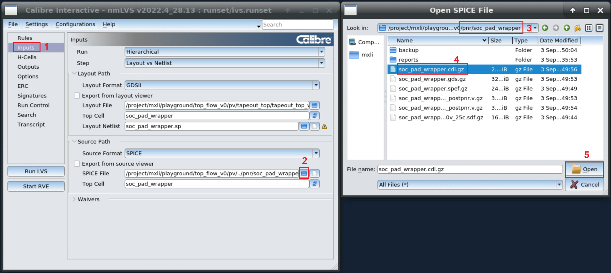 随后,在 Calibre Interactive 窗口中选择 Inputs,并在 Netlist 中导入 Innovus 生成的 CDL 网表文件,步骤如下。