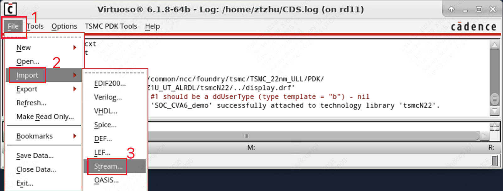 新建一个 Library 之后,回到 Virtuoso Terminal,并选择 File -> Import -> Stream,如下所示。