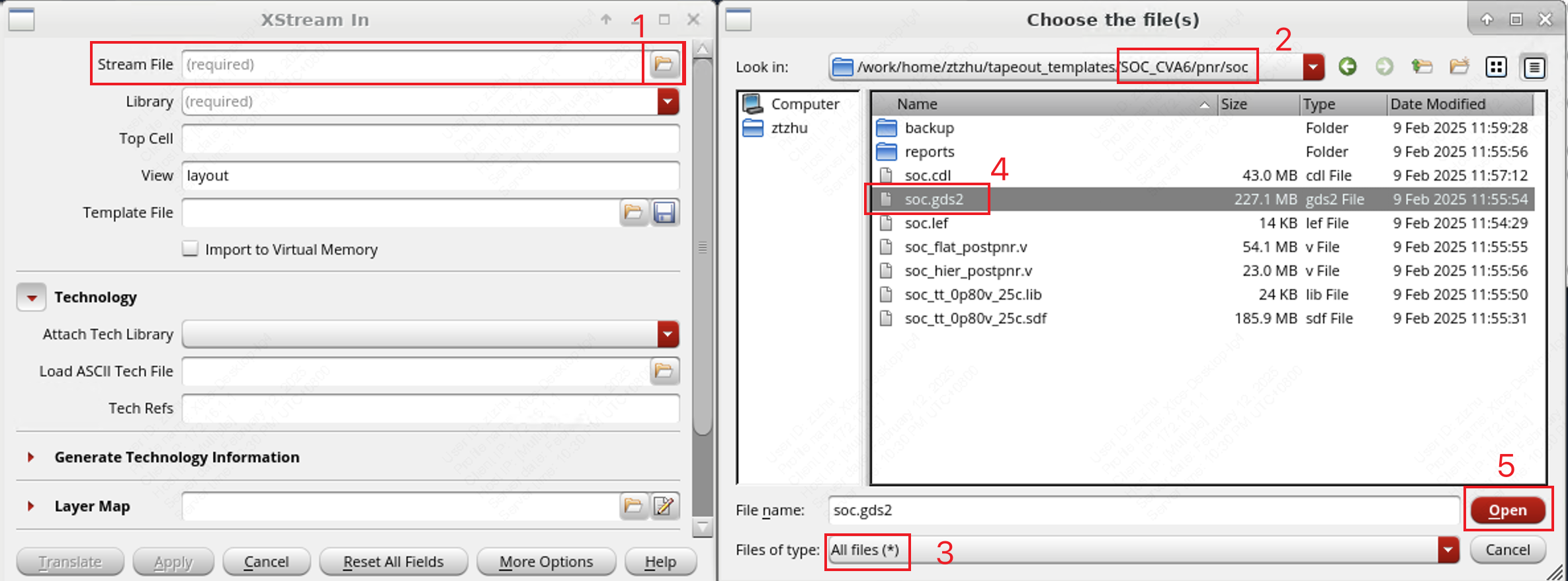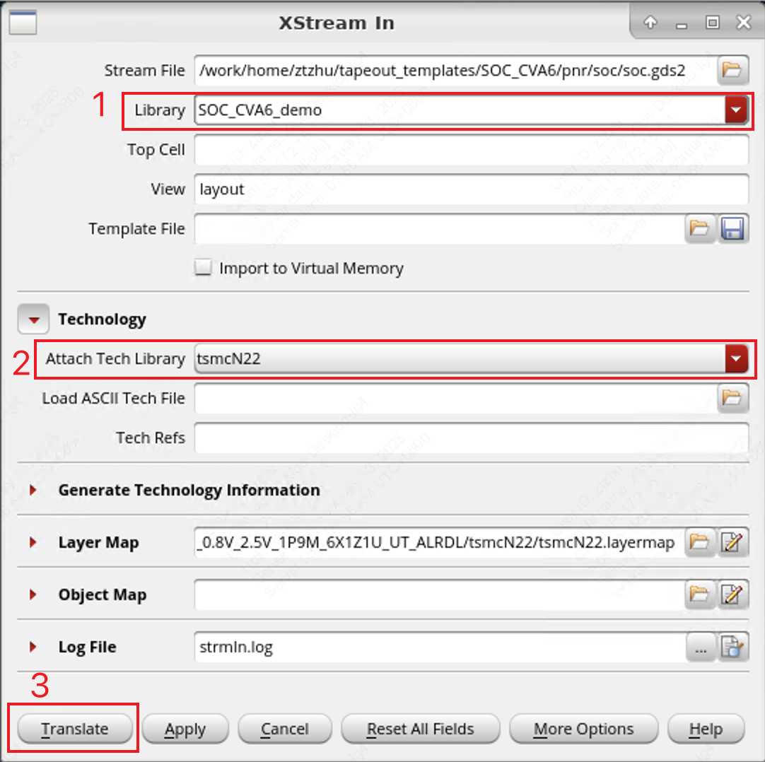 随后,在弹出的 XStream In 窗口中导入我们设计的 <top_module_name>.gds2 文件。文件在 pnr/<top_module_name> 文件夹下生成。之后,选择将设计导入到之前新建的 Library 中,最后点击 Translate。