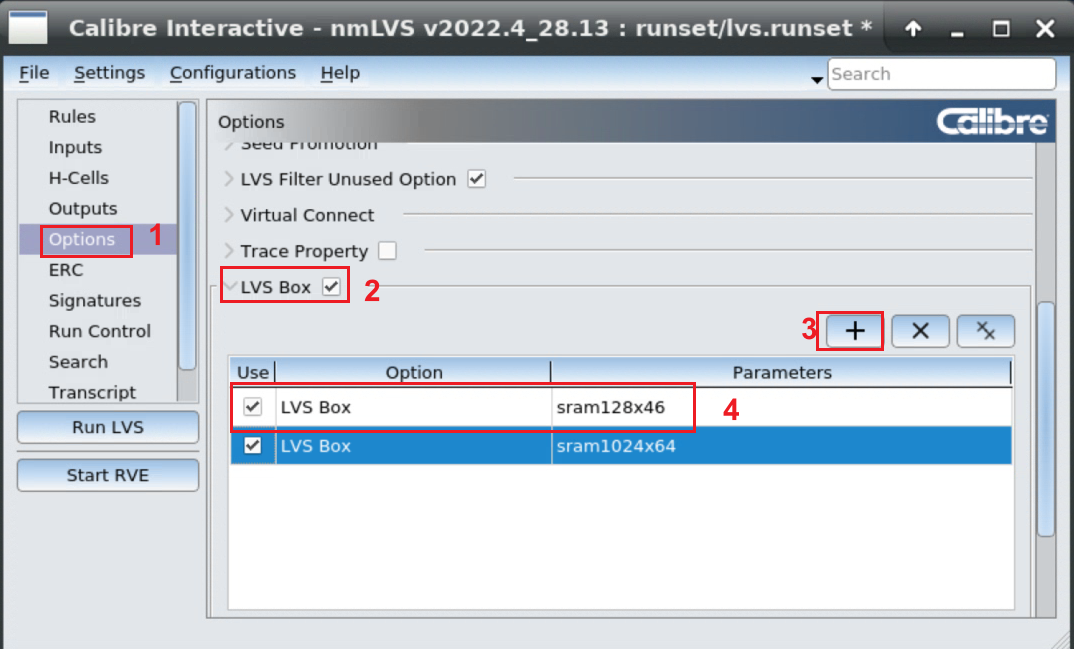 LVS Box可以选择 (a) 不处理特定的模块或者子电路,进行常规的 LVS 流程;(b) 根据设计的情况选择添加 LVS Box,需要在 GUI 界面中手动添加想添加 Box 的子模块名称,名称需要和 Virtuoso 设计中 Cell 名称保持一致。如下图所示,我们给 CVA6 CPU 中的 2 种 SRAM IP 添加了 LVS Box。