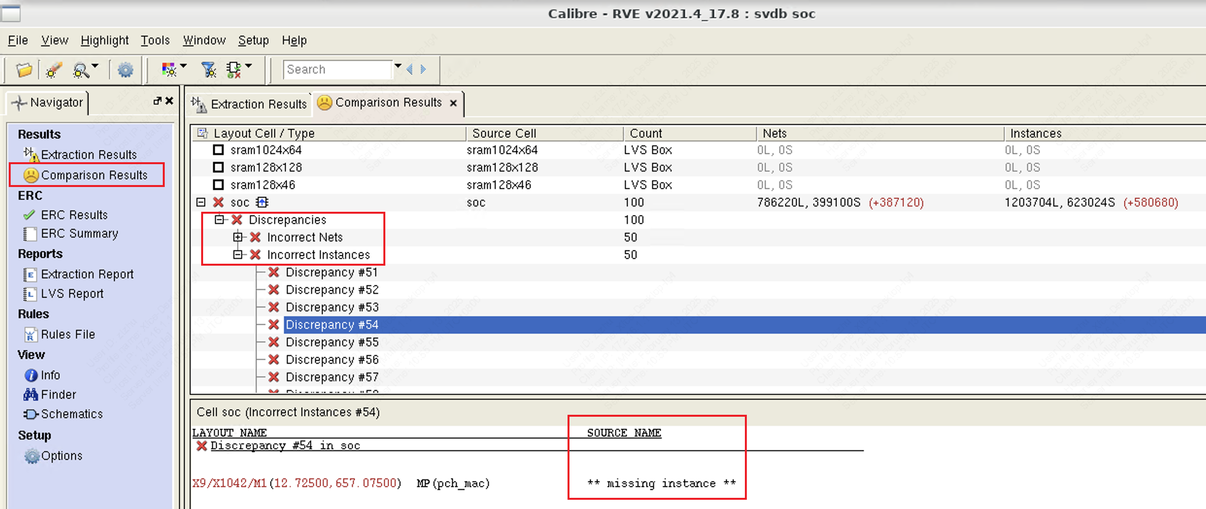 在此展示一种通过 Filter Unused Device Options 中的设置解决 LVS 报错的例子。对于我们的 CVA6 CPU 进行层次化 LVS 物理验证,并将 SRAM IP 设置 LVS Box,只对逻辑综合出来的标准单元进行物理验证,最终 LVS 报告如下,显示有许多的 Instances 和 Nets 在网标中缺失。