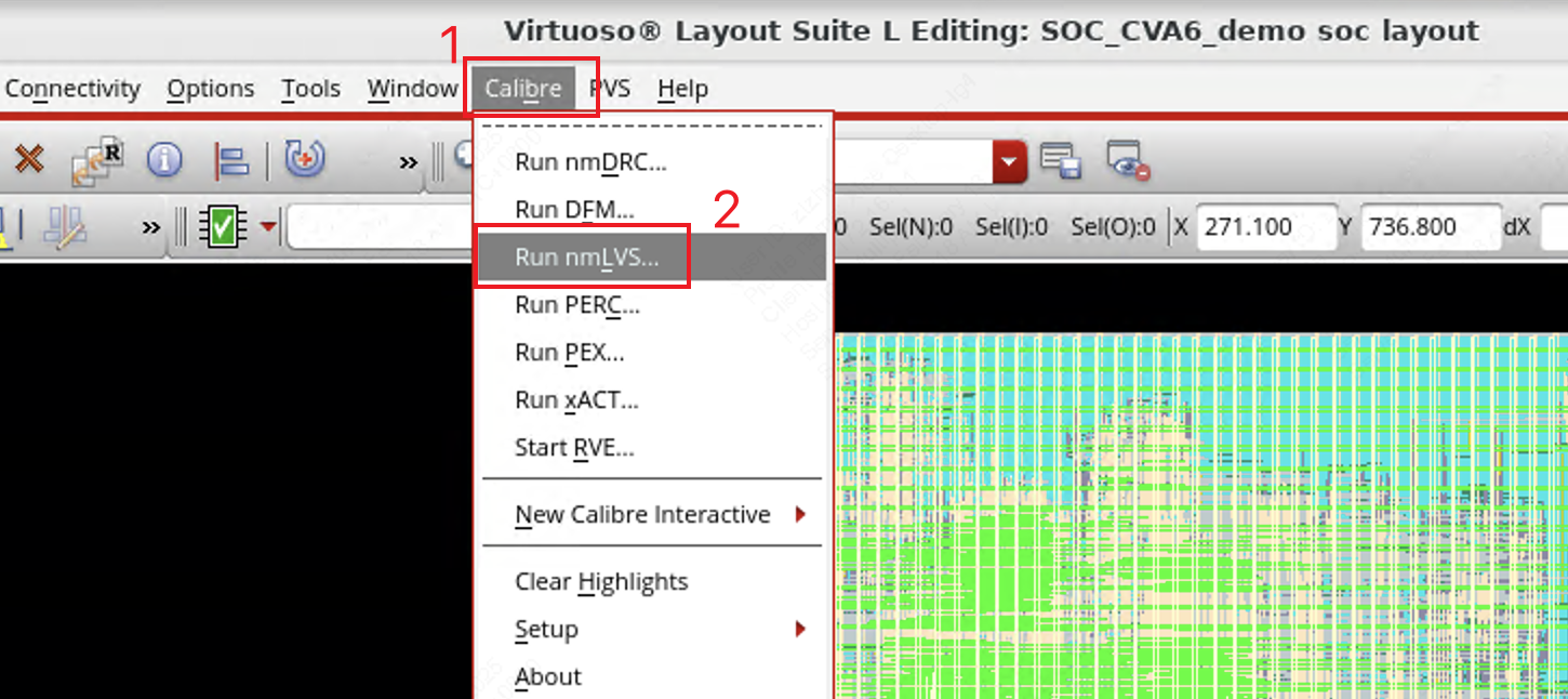 在 Virtuoso Layout Suite L 上方菜单栏中选择 Calibre -> Run nmLVS,如下所示。