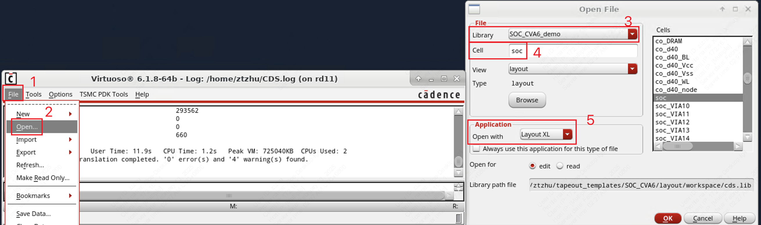 如果之前已经把设计导入到 Virtuoso 中,则可以在 Virtuoso Terminal 中选择 Open 打开设计,具体步骤如下所示。
