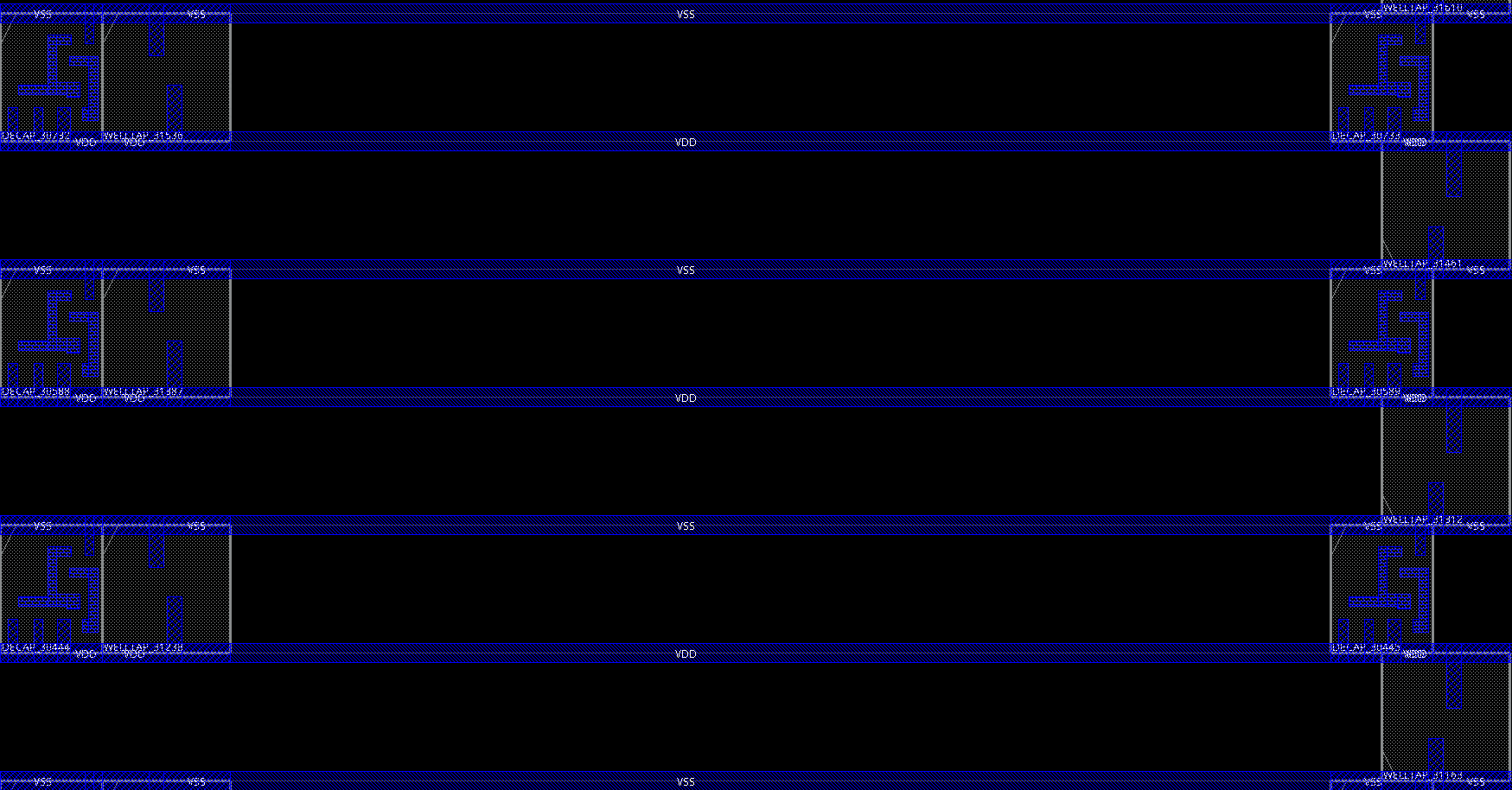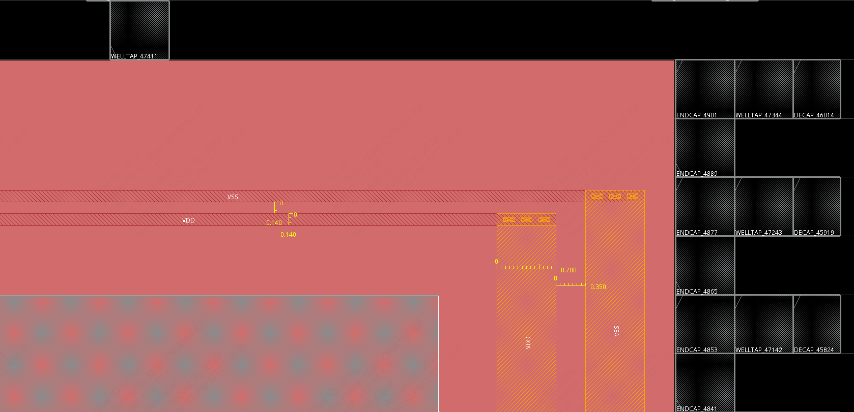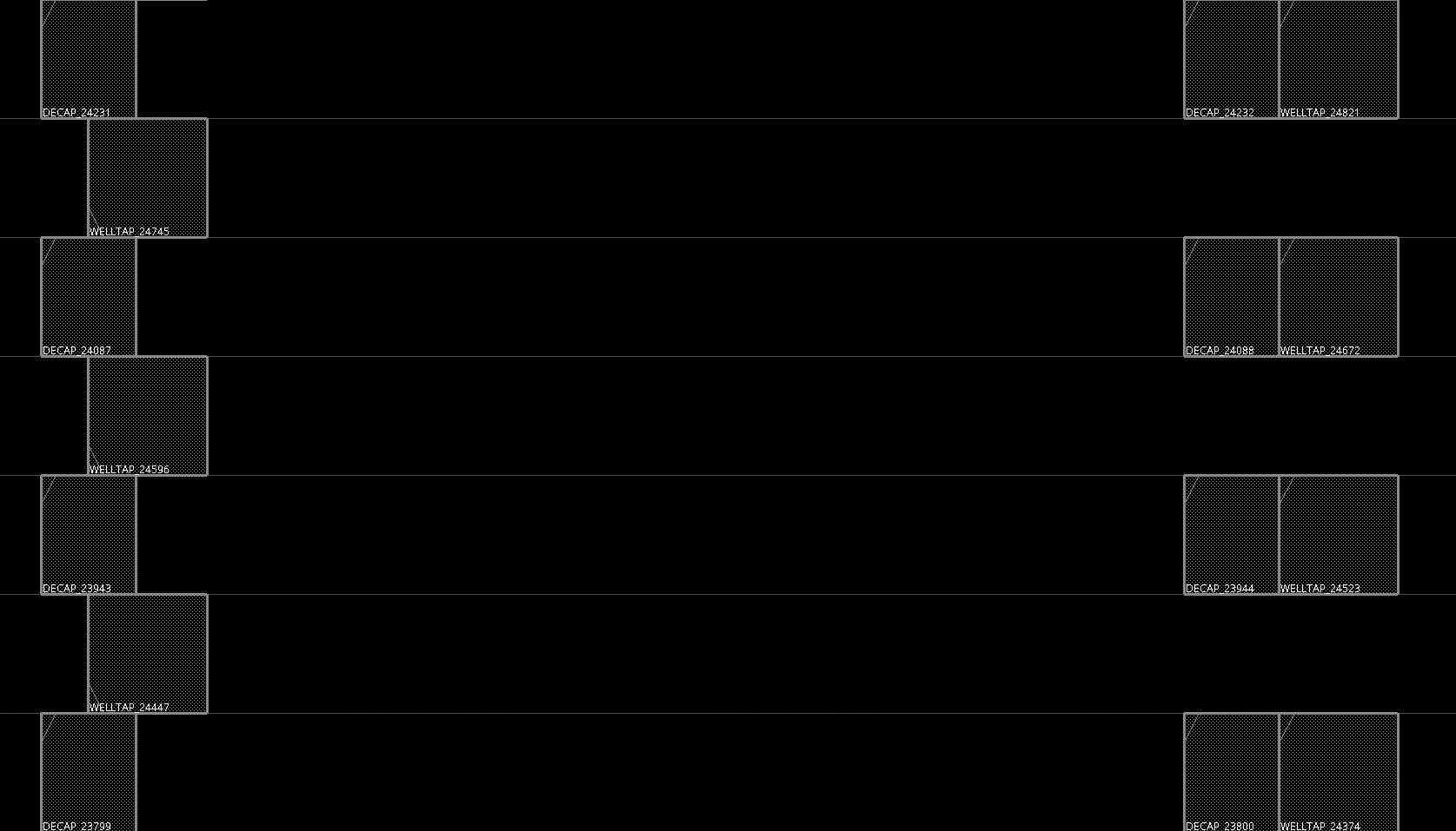 整个版图中没有摆放标准单元的区域称为空白区域,需要通过版图填充(Filler)填充,以保证版图的平衡性和均匀性。 我们使用 Decap 作为填充单元,进一步增强电源的稳定性。
