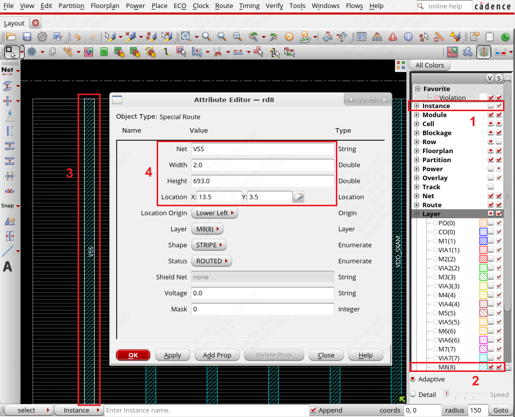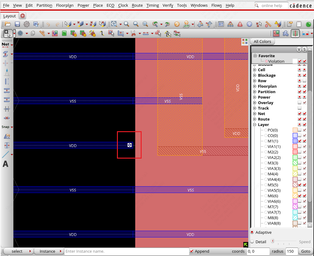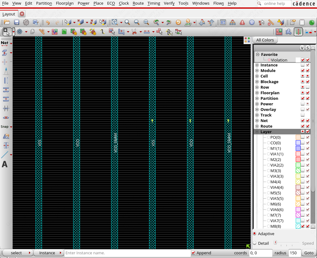 可以通过 GUI 查看最高层 Power Stripe 的位置和大小,如下图所示。
