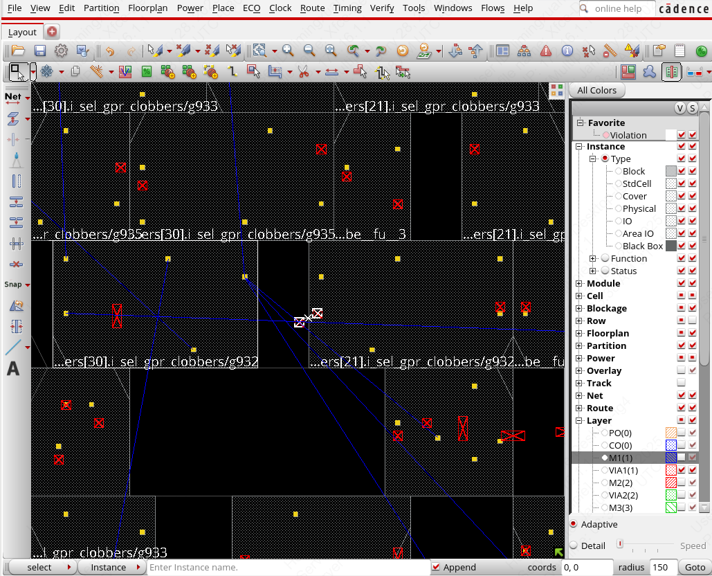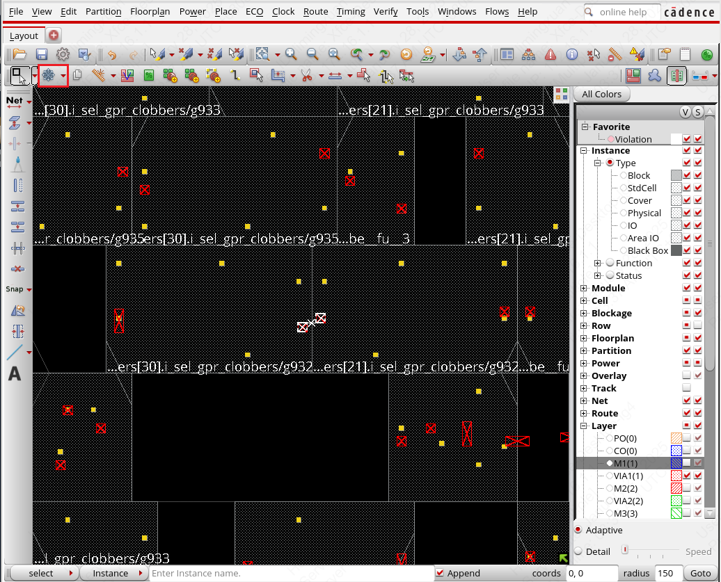如果 DRC 的数量在 20 以下,且都为 M1-M3 的错误,大概率这些错误是由于标准单元之间摆放地过于紧密导致。 我们可以手动调整有 DRC 违例的标准单元。