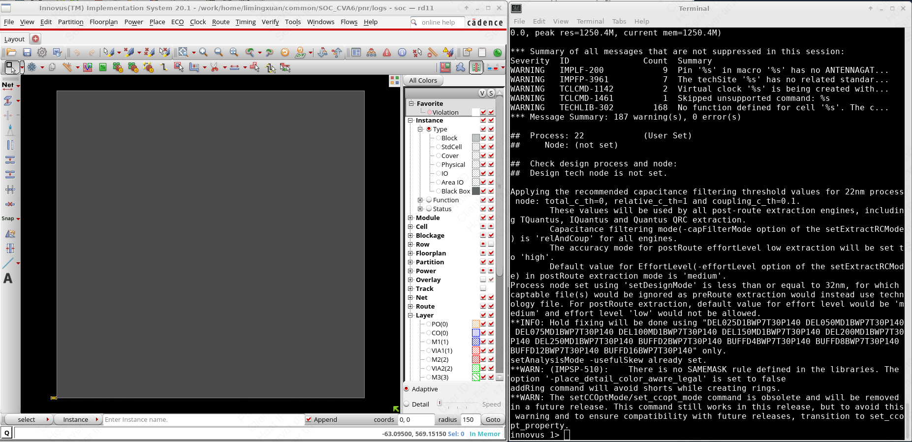 如果成功运行,会弹出 Innovus GUI 界面,并且终端处于 Innvous 命令行模式,如下图所示。