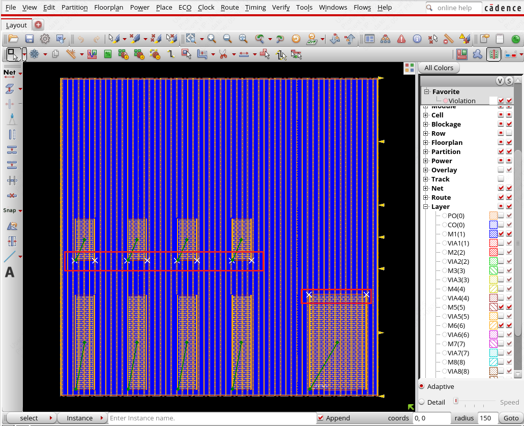 如果在 GUI 中打开各个金属层的显示,可以发现上述命令不仅仅完成了标准单元的放置,还完成了信号线的互联。