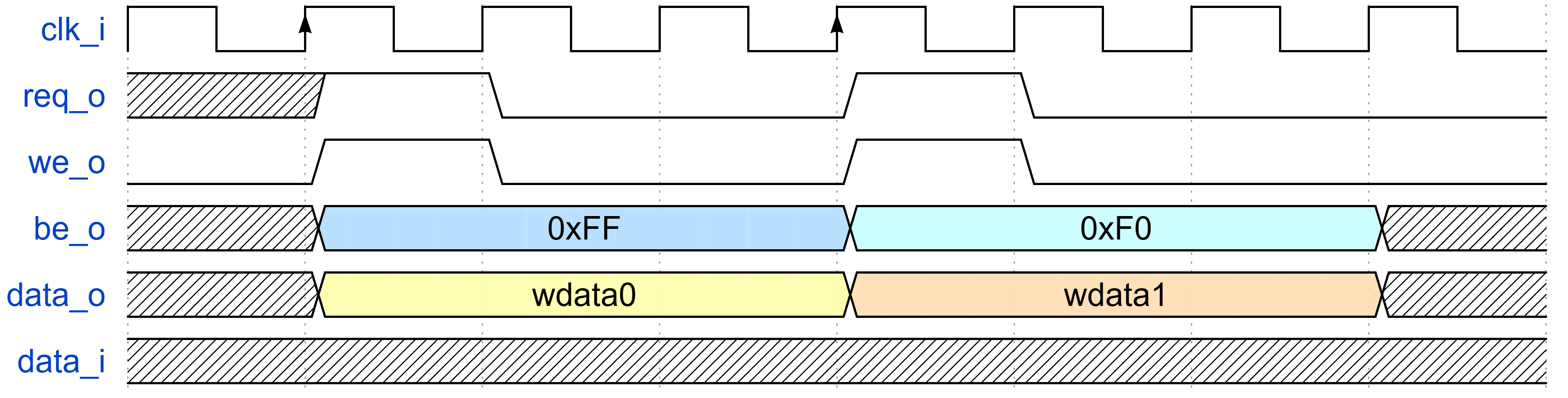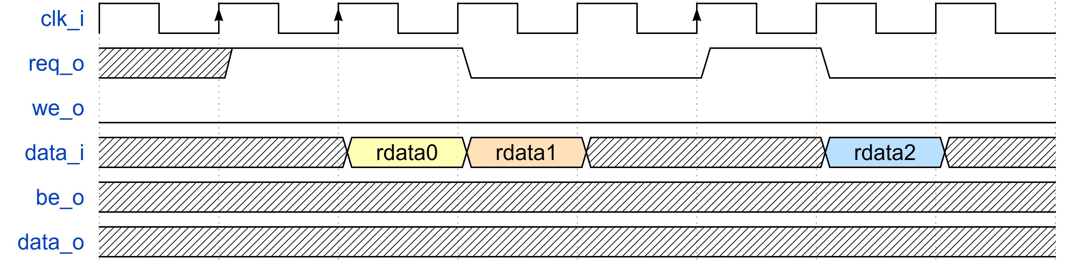 对于读操作,上述端口会采样 req_o 拉高的下一个周期的 data_i 信号。