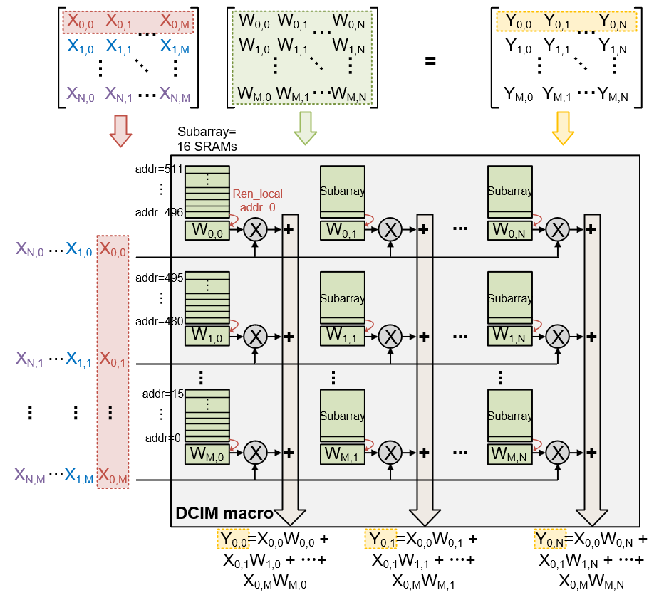 DCIM 的规模为 512 行 x 256 列。 对于一列中的 512 个 SRAM 单元,每 16 个 SRAM 单元构成一个 subarray,一共有 32 个 subarray。