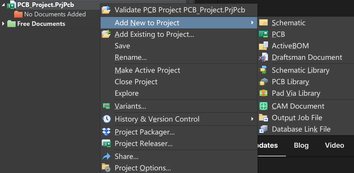 - 在创建的 project 下添加新的 schematic 与 PCB