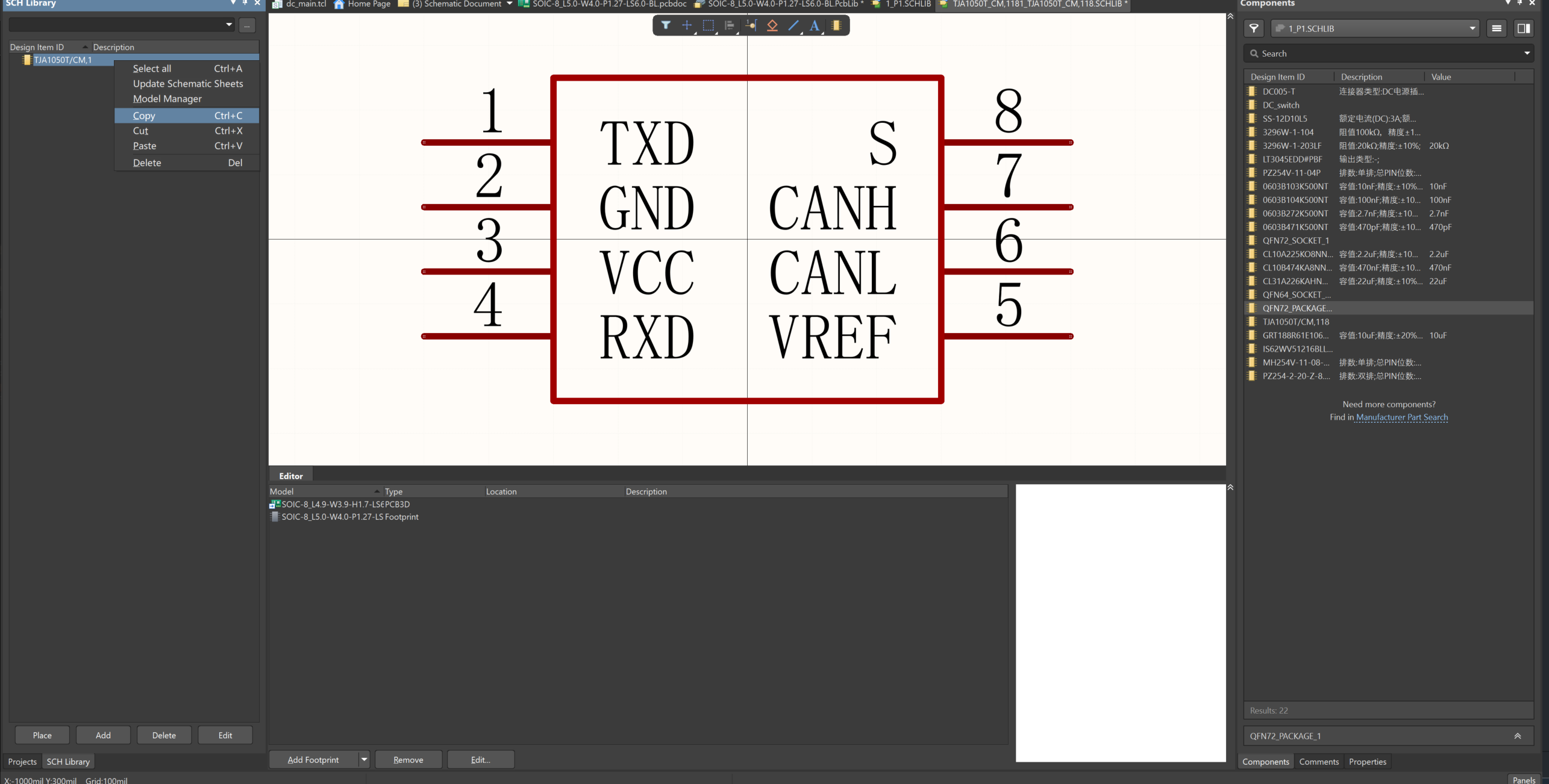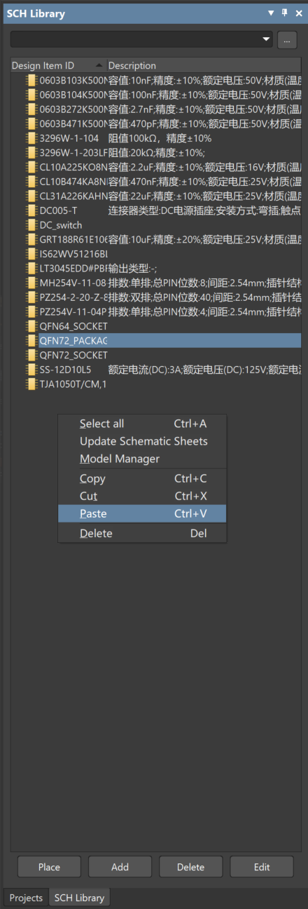 打开对应的 Library,copy 对应的 component,然后在右侧的Components中选择对应的库,随便找一个元件右键选择Edit来打开这个库,再将刚刚复制的 component 粘贴进去即可。