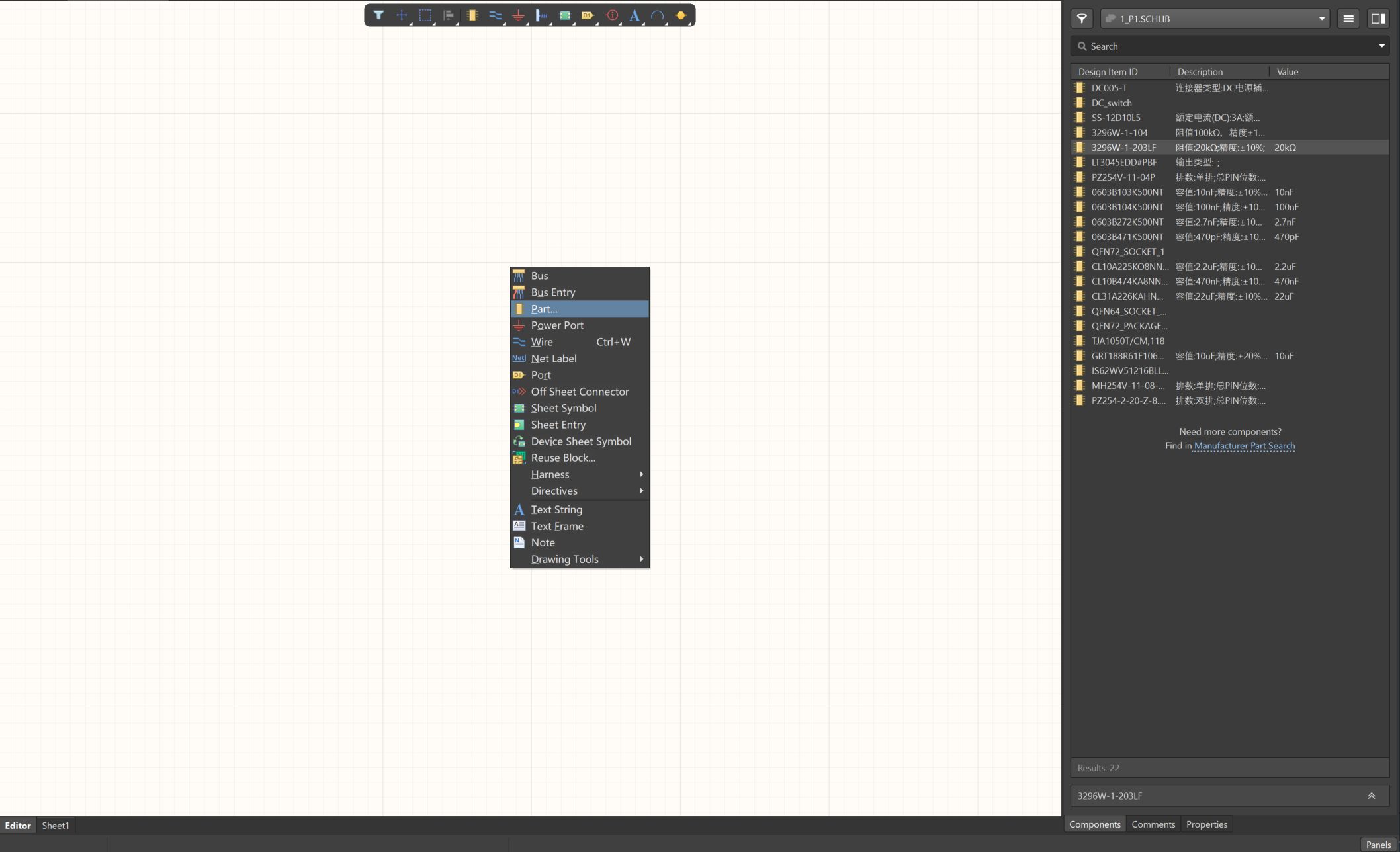 现在可以在 schematic 绘制电路图,P 键可以弹出绘制的选择面板,Place Part会在右侧现实 component 的 SCHLIB,将想要的器件拖到 schematic 中,然后进行连接。