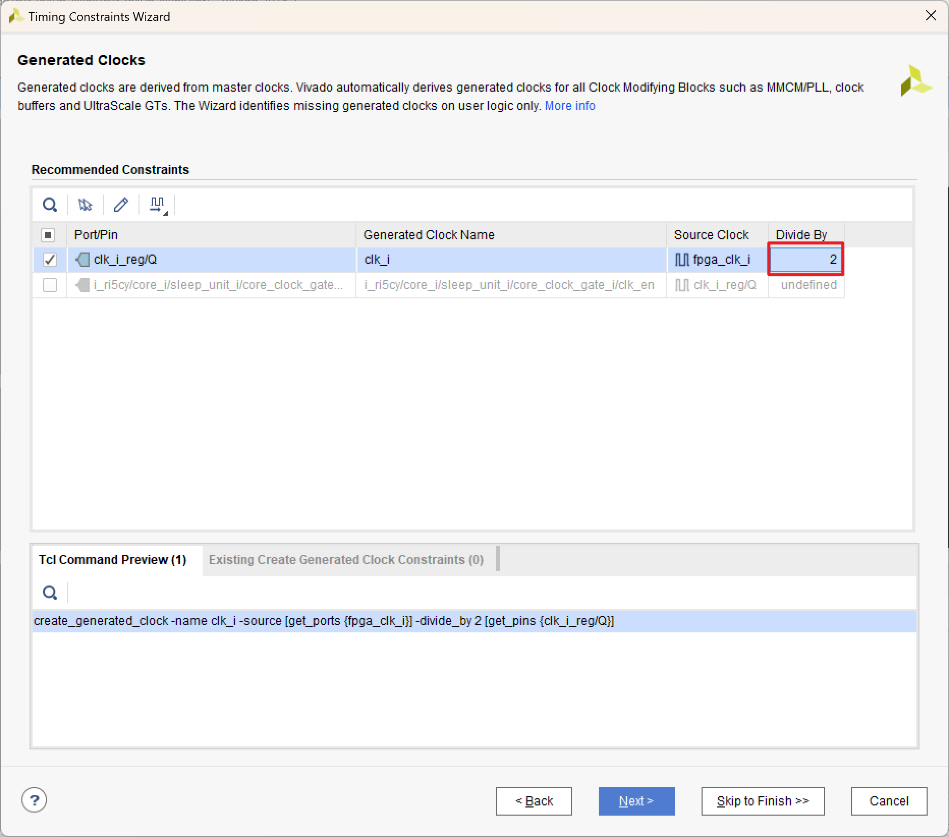 有时由于 FPGA 内置时钟的频率不满足我们的需求,可能需要分频器产生其它频率的时钟,Vivado 也会识别出这些生成的时钟: