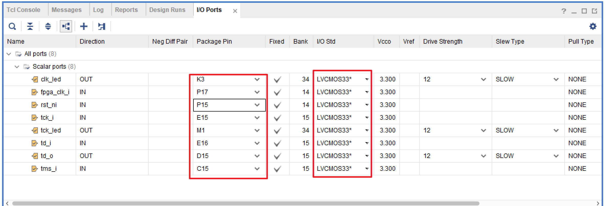 我们需要将每个 IO 端口映射到 FPGA 上的某个管脚并且在 IO Std 一栏规定管脚的供电方式。